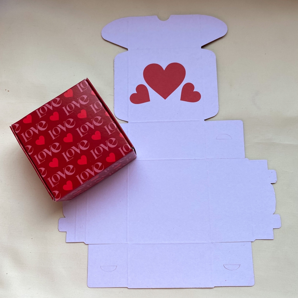 vermelha na parte externa, escrito "love", e branca com corações vermelhos no interior. ideal para você dar de presente, junto com os nossos acessórios.