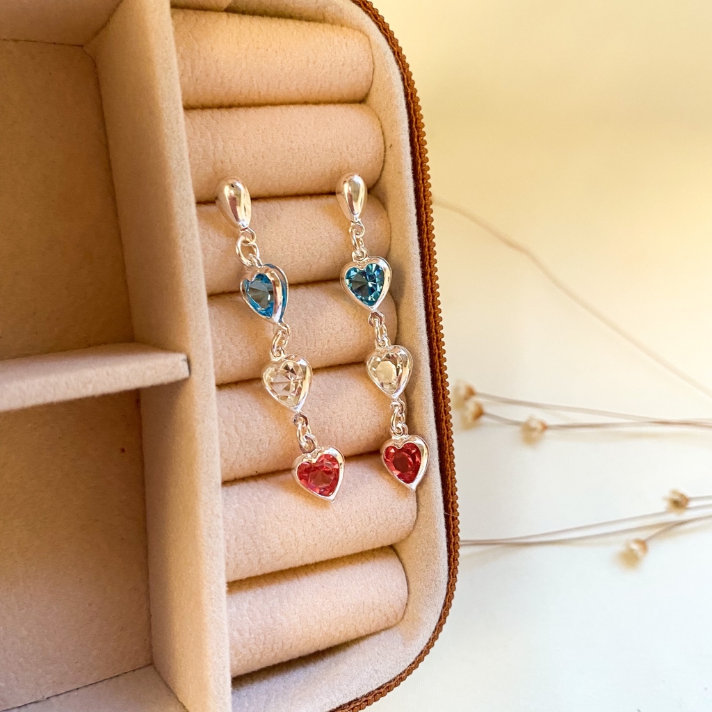 tarraxa borboleta, pingentes no formato de coração com pedras nas cores: azul turquesa, transparente e rosa pink. tamanho 4cm