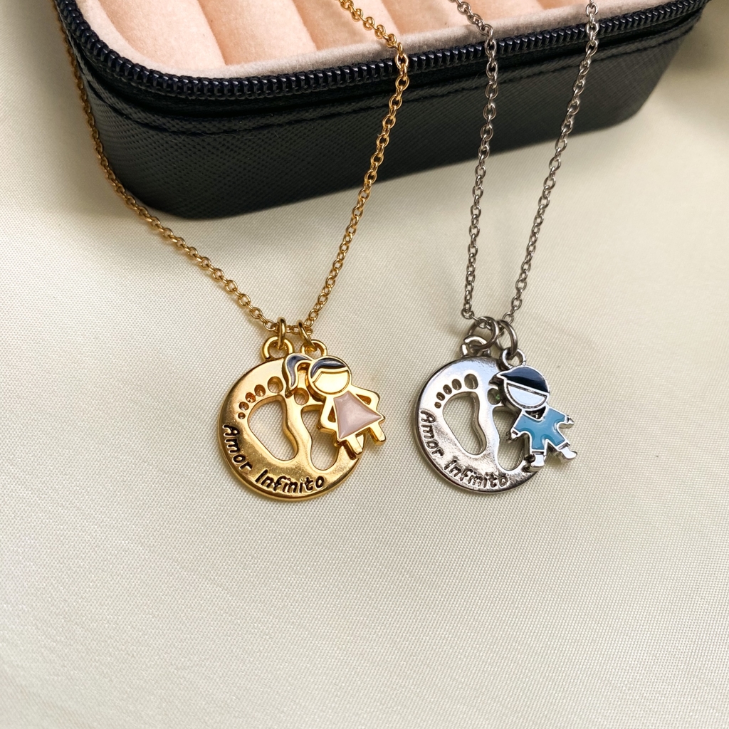 verniz italiano, banho de ouro ou prata e hipoalergênico, ALTA DURABILIDADE vem com 2 pingentes: pezinho + boneco na opção escolha a cor e o boneco que deseja